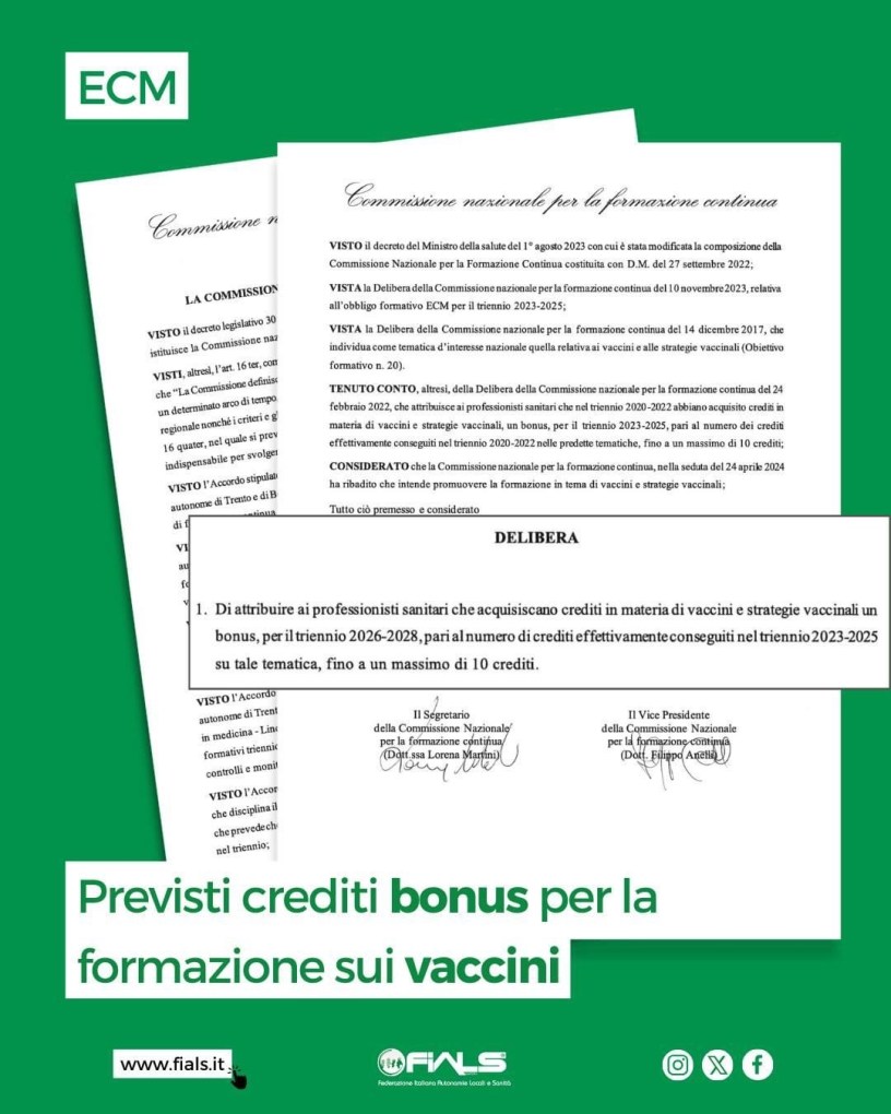 La Commissione nazionale ECM – con delibera n. 5/24 – ha stabilito un bonus per i sanitari che hanno incluso #vaccini e strategie vaccinali nei crediti formativi #ECM accumulati nel triennio in corso (2023-2025). Il bonus, riferito al triennio 2026-2028, è pari al numero di crediti effettivamente conseguiti nel triennio 2023-2025 su tale tematica, fino a un massimo di 10 crediti, che andranno a ridurre l’obbligo formativo 2026-2028 e permetteranno al professionista di partire con 140 crediti da totalizzare, invece di 150.