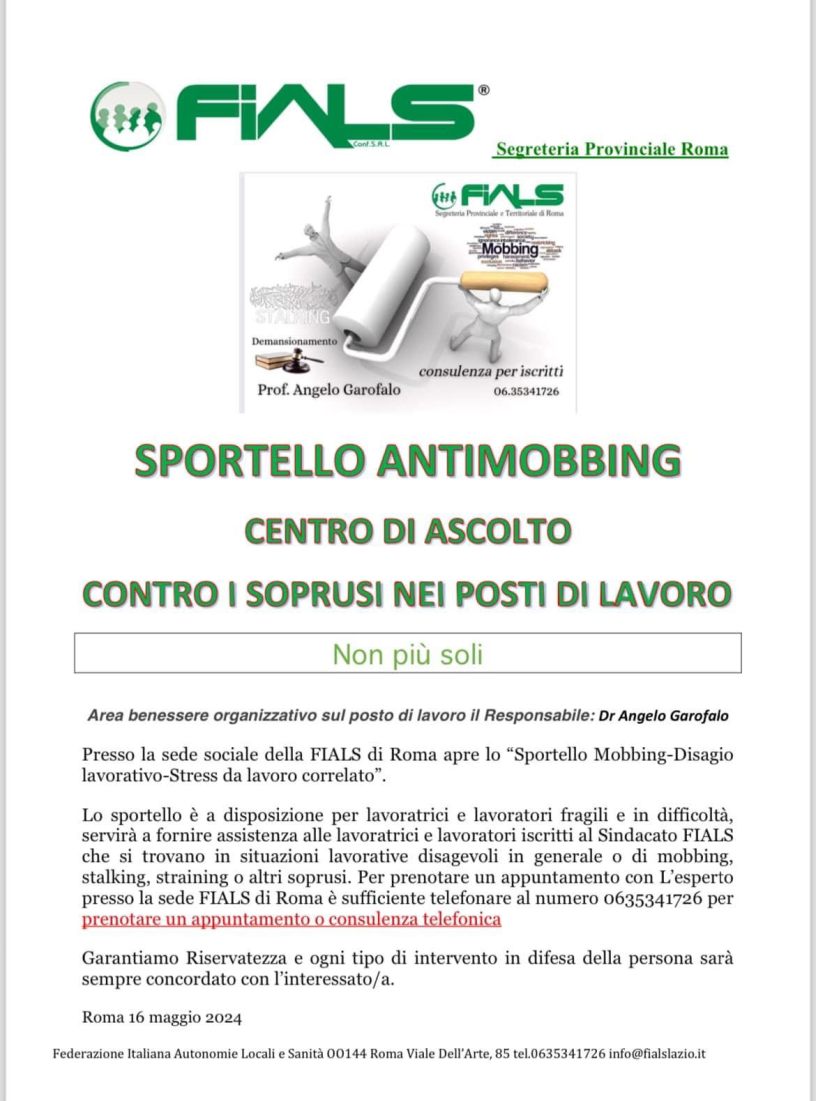 Notizie Sportello Anti Mobbing Date: 1 giugno 2024Author: Fials Roma 0 Commenti Questo servizio è a disposizione di tutti gli iscritti Fials. Condividi: Condividi su X (Si apre in una nuova finestra) X Condividi su Facebook (Si apre in una nuova finestra) Facebook Mi piace Caricamento... Correlati