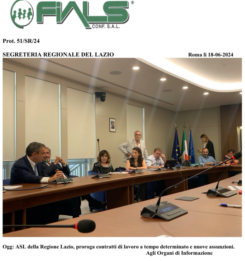 Si è concluso oggi alle ore 14,00, l’incontro tra alcune organizzazioni sindacali del comparto sanitario, tra i quali i delegati FIALS, Ricci Federico, Librandi Michelangelo, Natalucci Alessio e la Regione Lazio, rappresentata dal Direttore Generale dr. Alessandro Ridolfi e dal Direttore integrazione socio sanitaria Andrea Urbani, nel corso del quale, ha partecipato anche il Presidente dott. Francesco Rocca si è preso atto dell’avvio dei provvedimenti per le nuove assunzioni già programmate e della proroga al 31-12-2024, di tutti i rapporti di lavoro a tempo determinato attualmente in essere nelle ASL/Aziende ospedaliere del Lazio.