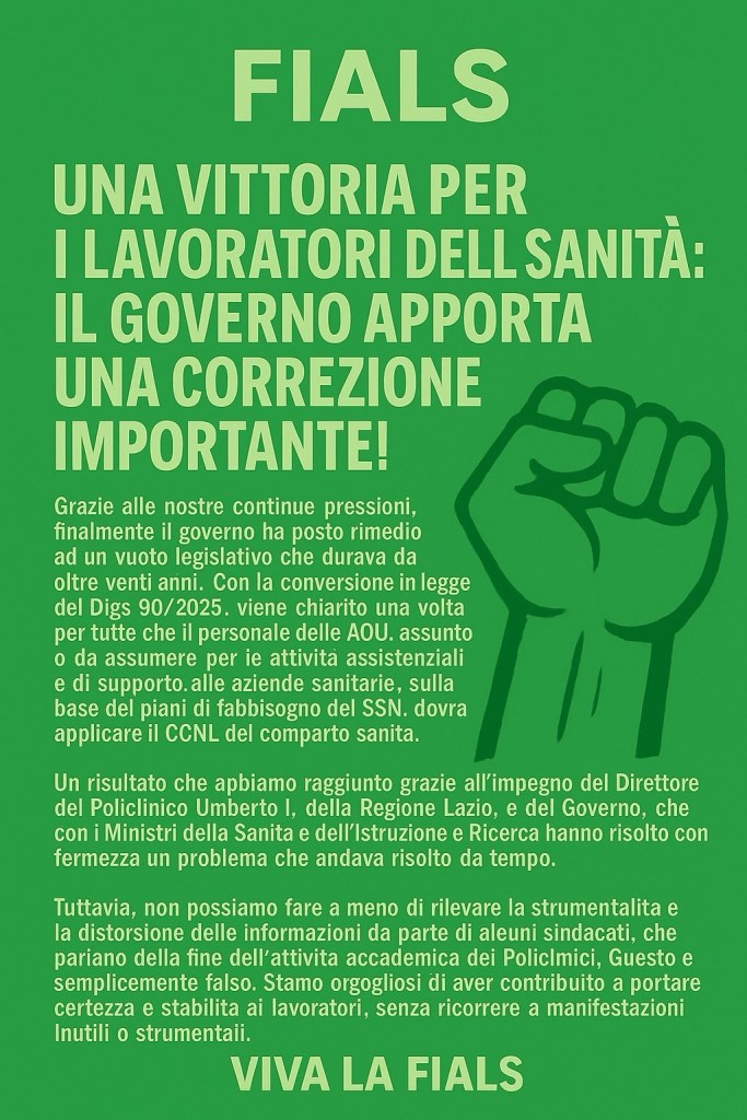 Tuttavia, non possiamo fare a meno di rilevare la strumentalità e la distorsione delle informazioni da parte di alcuni sindacati, che parlano della fine dell’attività accademica dei Policlinici. Questo è semplicemente falso. Siamo orgogliosi di aver contribuito a portare certezza e stabilità ai lavoratori, senza ricorrere a manifestazioni inutili o strumentali.