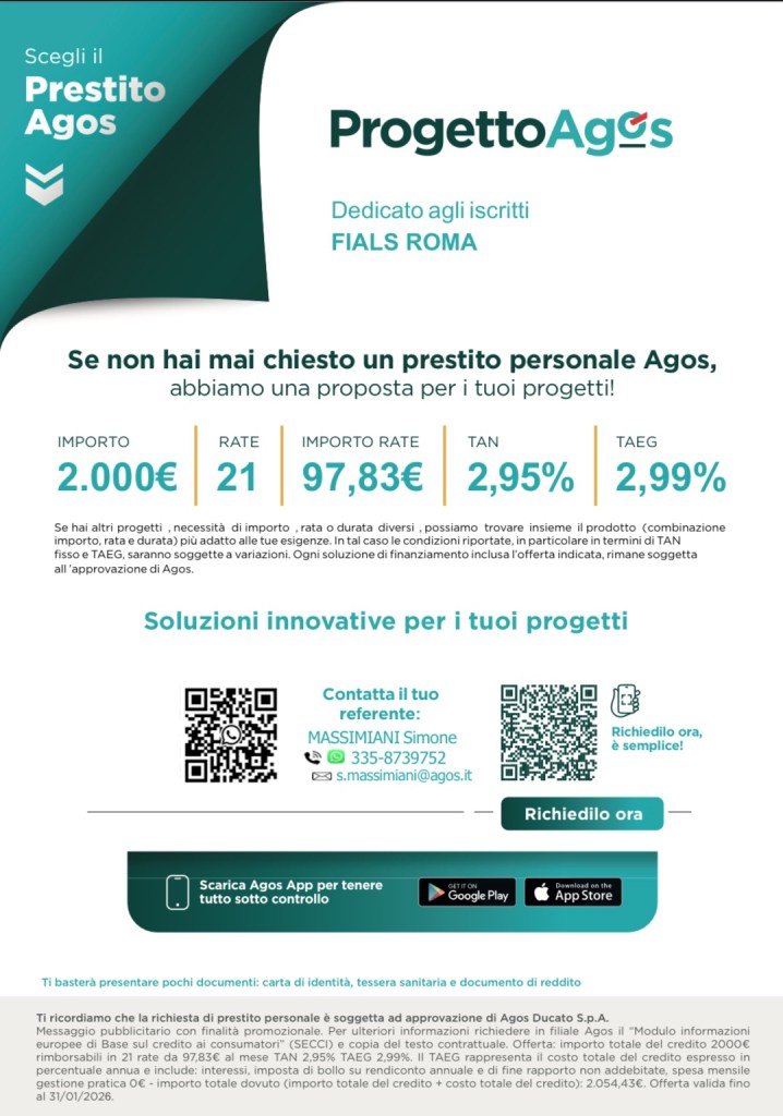 Notizie Prestito AGOS Date: 20 gennaio 2026Author: Fials Roma 0 Commenti Condividi: Condividi su X (Si apre in una nuova finestra) X Condividi su Facebook (Si apre in una nuova finestra) Facebook Mi piace Caricamento... Correlati
